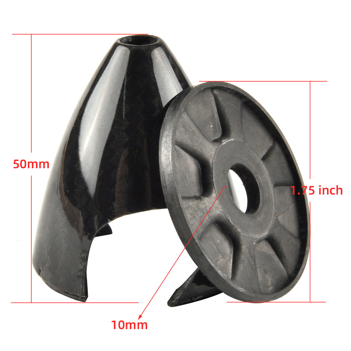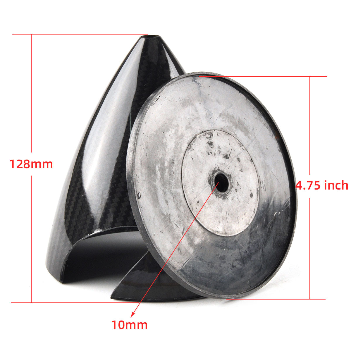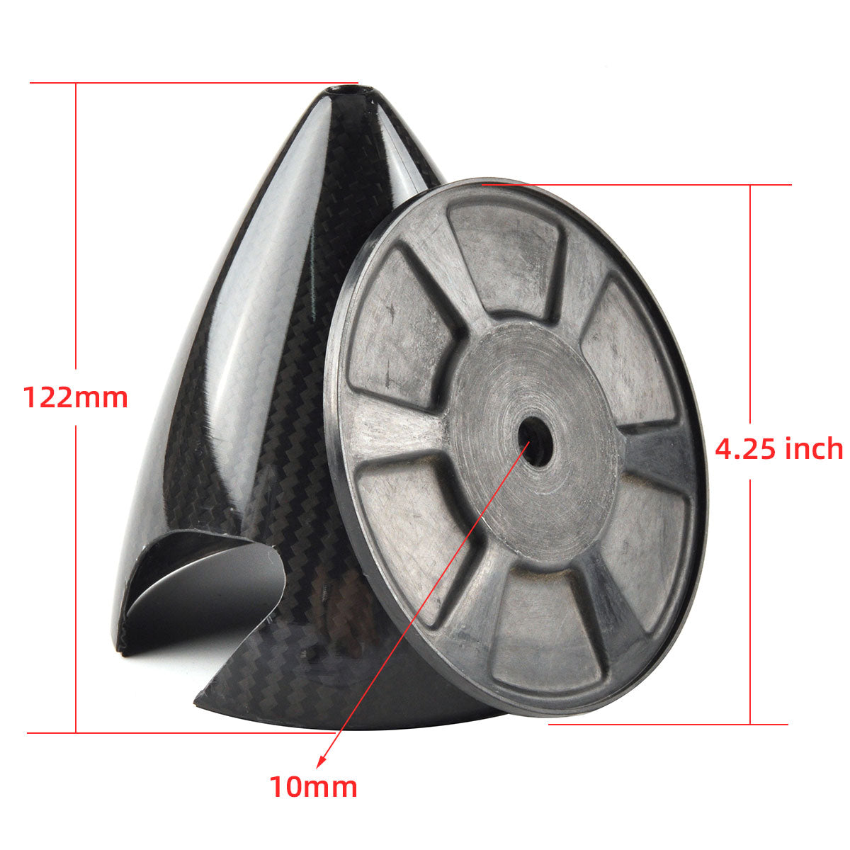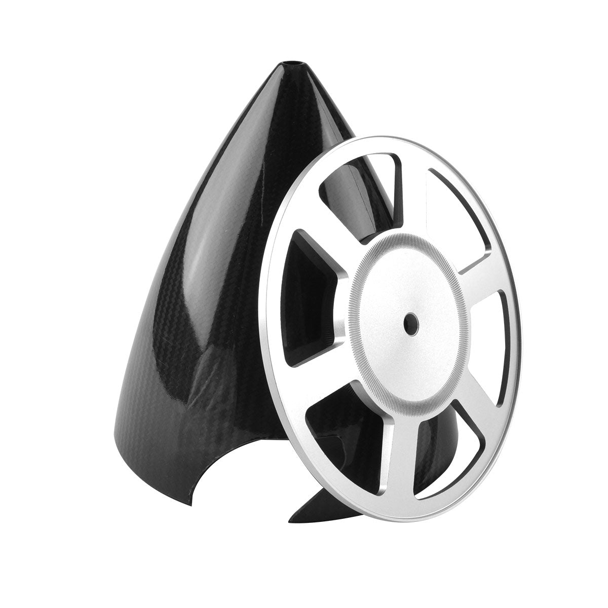 - Material: Carbon fiber cone with carbon fiber back plate. (The back plate of the 7 inch spinner is aluminum.)