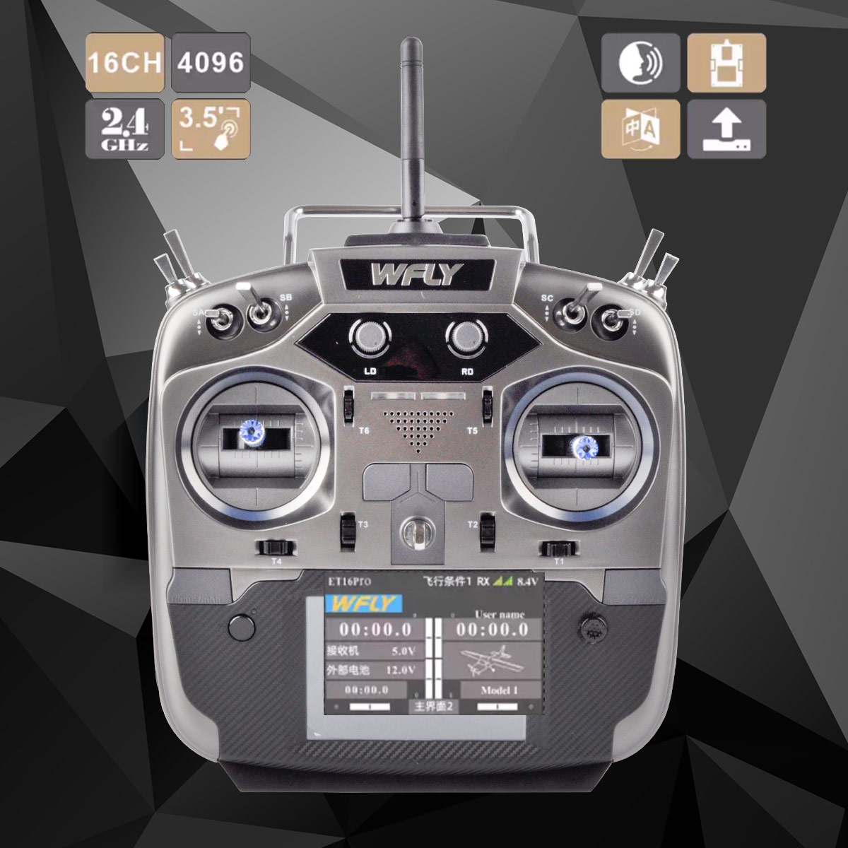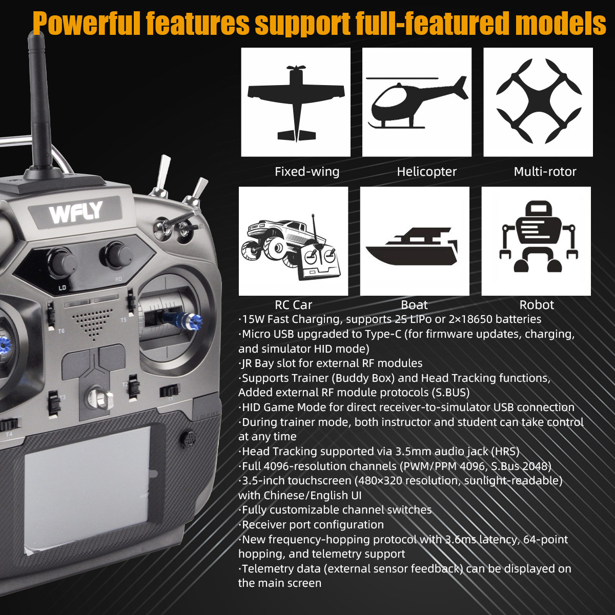 Flysky ET16S 2.4GHz RC Transmitter CNC Metal Hall Sensor Gimbal 15W Fast Charging