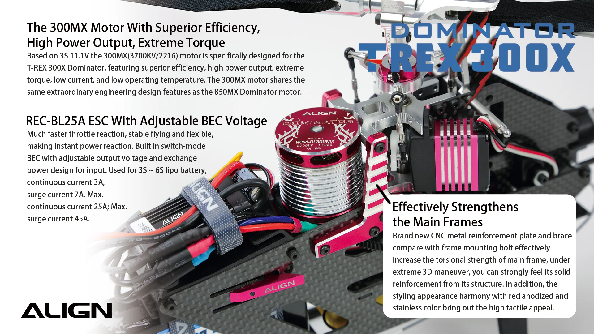 Align newly designed T-REX 300X, small but all-in-perfect. It adopts DFC rotor head unit, low CG and low wind resistance providing direct flight responses. The carbon fiber main frame is made of composite material and with reinforcement plate and brace assembly effectively enhancing structural intensity and torsion resistance. Narrow body design makes mechanical structure much stronger. The battery slider and top-mounted motor design with anodized bright red color brings pretty texture on this model. Thicken aluminum alloy tail boom for the best torsion resistance and increase the tail support rod lifetime. The progressive lightweight landing skid making this model the leader in this class. Plus the fiberglass painted canopy features lightweight and low in wind resistance.