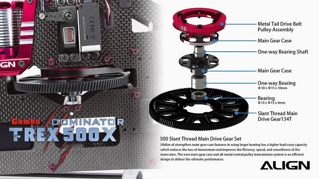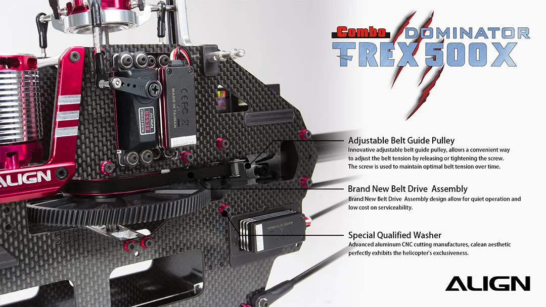 Refresh and refine, T-REX 500X adapt with brand new FL rotor head system, utilizes an extremely low CG design which reduces resistance during 3D maneuvers while increasing flight responsiveness and precision. A progressive design adds a gloss silver and red anodizing appearance which continue our quality development based on our 700 class helicopter. The T-REX 500X main frame utilizes composite material integration technology on carbon side frame plates, including the addition of battery mounting side rails, and a top motor mount design. Innovative adjustable belt guide pulley, allows a convenient way to adjust the belt tension by releasing or tightening the screw. The screw is used to maintain optimal belt tension over time to keep the best. Also T-REX 500X landing skid is tilted 5 degrees forward to improve crashworthiness.
