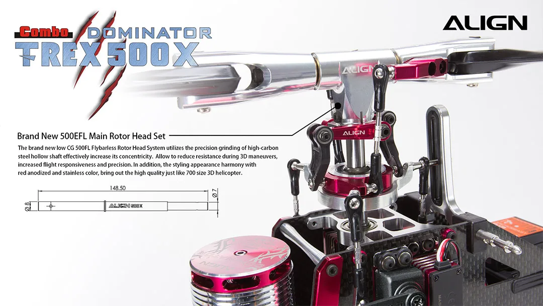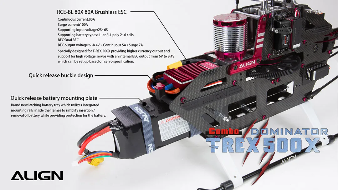 T-REX 500X utilizes 470mm main blades and 520MX(1600KV/3527) motor with 20% power upgrades than the original 1600KV/3225 motor. The latest new RCE-BL80X Brushless ESC support dual BEC output from 6 ~ 8.4V providing efficient and superior power. The NEW DS530/DS535 digital servos are with extreme torque and speed response allow to support faster, more precise and accurate flight performance.